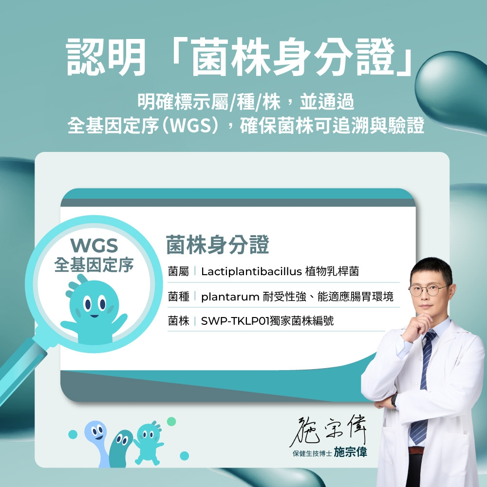 - 具備獨家菌株編號 SWP-TKLP01,並已完成全基因定序(WGS),可追溯、可驗證,不是模糊菌名