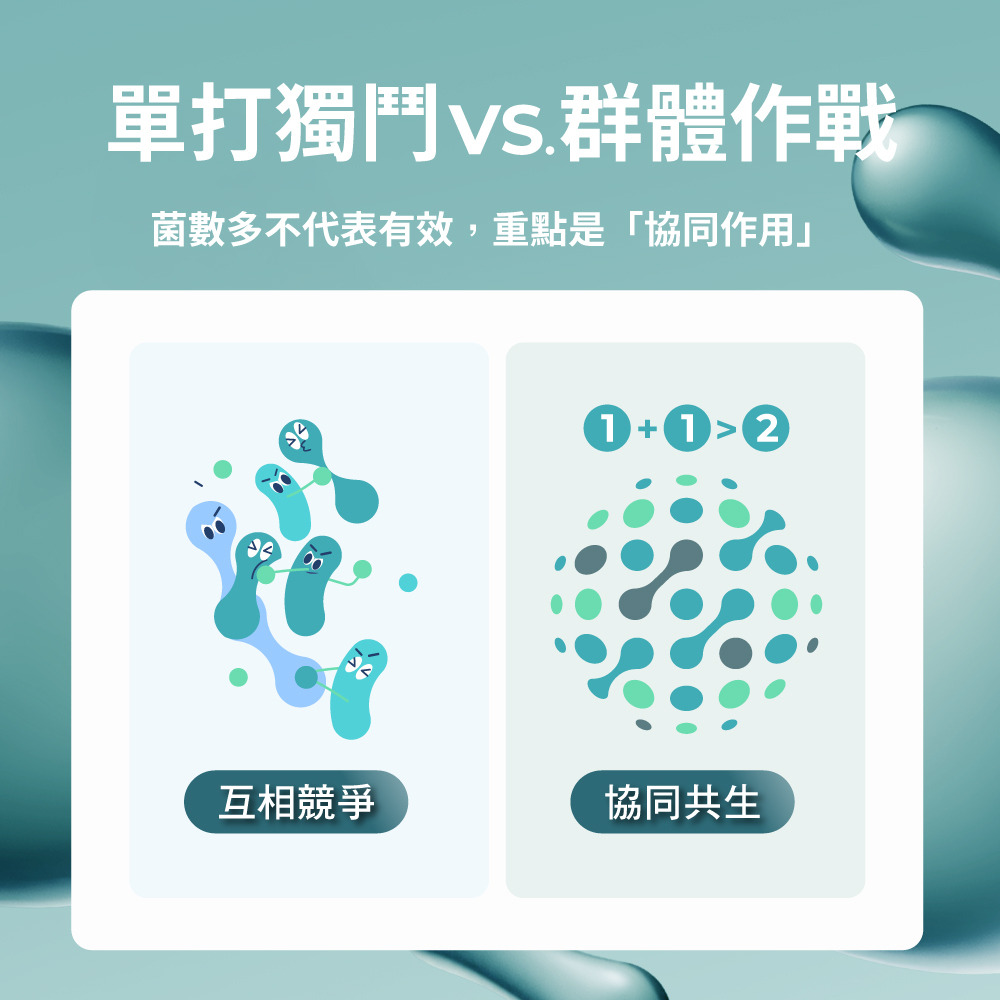 市面上許多產品標榜幾百億菌數,但若菌種間互相競爭營養,反而會削弱效果。黃金準則建議:多菌株必須具備協同作用。