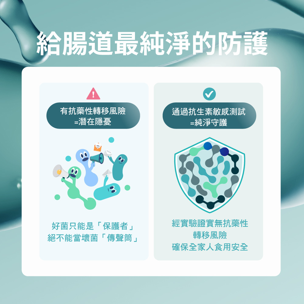 這是最容易被忽視的黃金準則。如果益生菌含有可轉移的「抗藥性基因」,進入腸道後可能會與壞菌交換資訊,讓致病菌學會躲避藥物,導致未來生病時藥物失效。記得嚴選通過嚴謹的抗生素敏感測試,證實無抗藥性轉移風險,確保補充的是「守護健康的好菌」,而不是潛在隱憂,讓好菌只做「保護者」,不當「傳聲筒」,給家人吃的,安全性必須是最高等級!