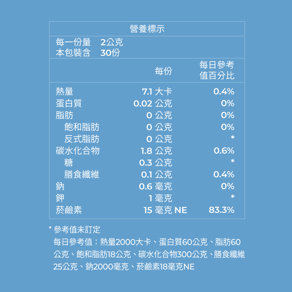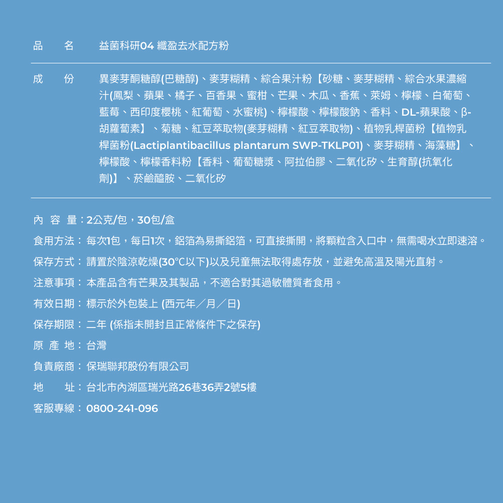 | 成份 | 異麥芽酮糖醇(巴糖醇)、麥芽糊精、綜合果汁粉【砂糖、麥芽糊精、綜合水果濃縮汁(鳳梨、蘋果、橘子、百香果、蜜柑、芒果、木瓜、香蕉、萊姆、檸檬、白葡萄、藍莓、西印度櫻桃、紅葡萄、水蜜桃)、檸檬酸、檸檬酸鈉、香料、蘋果酸、β-胡蘿蔔素】、菊糖、紅豆萃取物(麥芽糊精、紅豆萃取物)、植物乳桿菌粉【植物乳桿菌粉(Lactiplantibacillus plantarum SWP-TKLP01)、麥芽糊精、海藻糖】、檸檬酸、檸檬香料粉【香料、葡萄糖漿、阿拉伯膠、二氧化矽、生育醇(抗氧化劑)】、菸鹼醯胺、二氧化矽 |