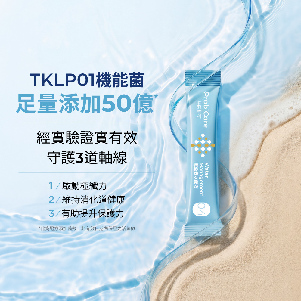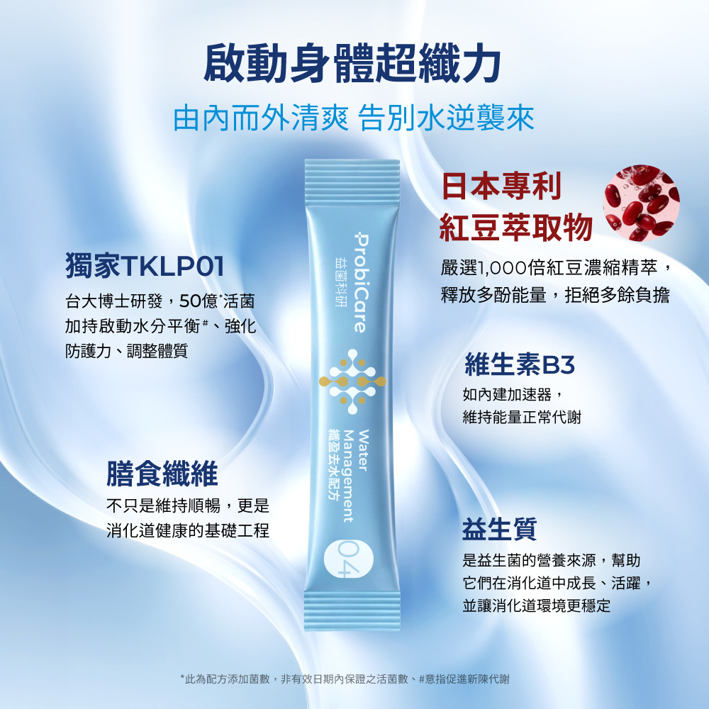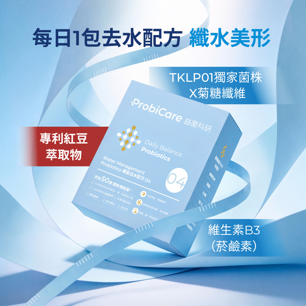 | 產品功效 | 纖水美形,為泡芙人擺脫隱形負擔而設計的益生菌配方 - 嚴選1,000倍紅豆濃縮精萃:日本專利北海道紅豆萃取物,鉀鈉18:1黃金比例,緊繃感釋放 - 維生素B3:提升能量正常代謝 - 水溶性膳食纖維:維持消化道機能 - 獨家機能益菌TKLP01:超纖力調節引擎,搭配菊糖纖維,啟動身體流水線 |