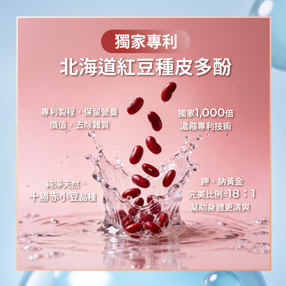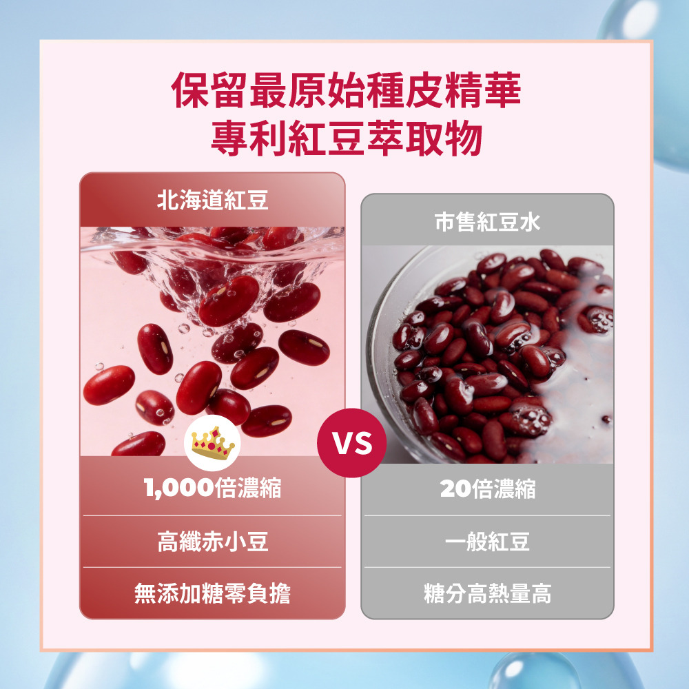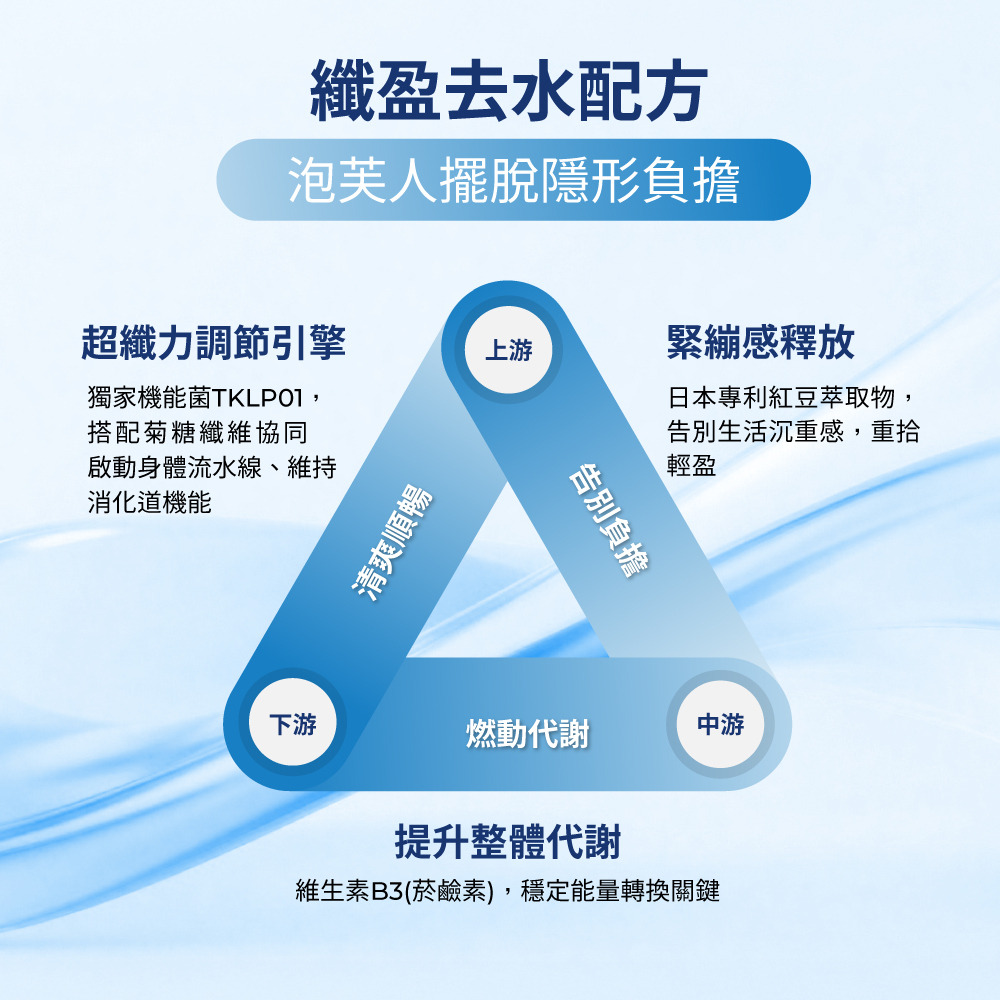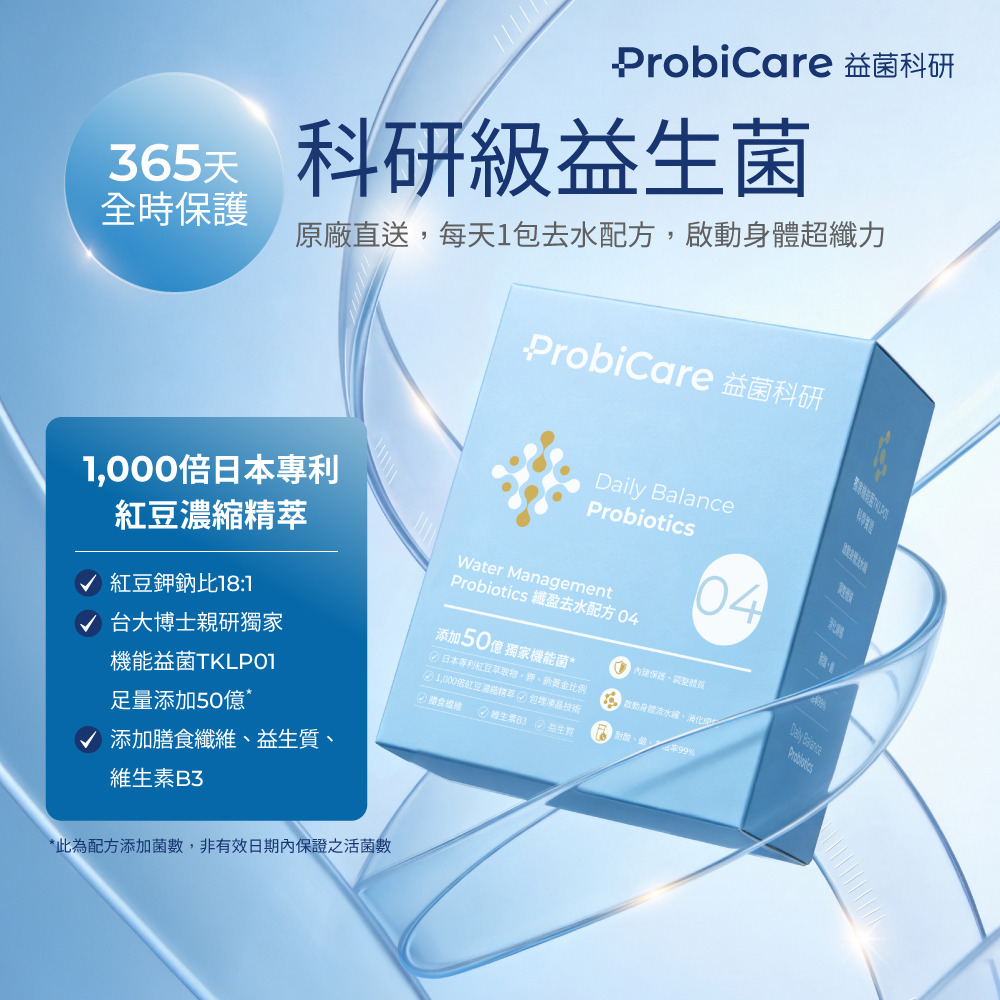 | 產品功效 | 纖水美形,為泡芙人擺脫隱形負擔而設計的益生菌配方 - 嚴選1,000倍紅豆濃縮精萃:日本專利北海道紅豆萃取物,鉀鈉18:1黃金比例,緊繃感釋放 - 維生素B3:提升能量正常代謝 - 水溶性膳食纖維:維持消化道機能 - 獨家機能益菌TKLP01:超纖力調節引擎,搭配菊糖纖維,啟動身體流水線 |